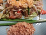 Both pork and chicken are served in small slices and fried with the rest of ingredients. The same applies to an extra serving of the tofu curd.