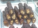 Cevizli sucuk is made of dried fruits (mainly grapes) and walnuts (rarer are pistachios, almonds or hazelnuts) that are hung on a string and then dipped in a thickened grape or other fruit's juice. Finally, it is shaped in a sausage or candle like form and left on the sun for drying and hardening. This process takes up to one week. Cevizli sucuk originates from Georgia, but Turkish cuisine has adopted it and also made some slight modifications.
