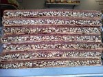 Hibiscus, lemon, orange, pomegranate, strawberry, apricot and mango flavors are the most typical for the jelly filling. The inner nougat like filling flavors usually include chocolate, nuts, coco, pistachio, almond or caramel. The dough for both layers is rolled and put one on the other. The lower layer is sometimes sprinkled with nuts, flower petals or coconut flakes from the outside. Then both layers are rolled and shaped in a cylinder form. When served, it is cut in 1-2 cm wide slices.